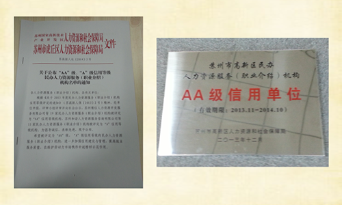 作为知名字号的同时,企业相继被评为“苏州市高新区民办人力资源服务(职业介绍)机构AA级信用单位”,“2013年度苏州市人力资源服务诚信企业”。公司以诚信为本,诚信用人,诚信办事为宗指,依凭着一颗赤诚的心为公众服务,为无数求职者提供就业机会,源源不断地为企业输送新鲜血液!